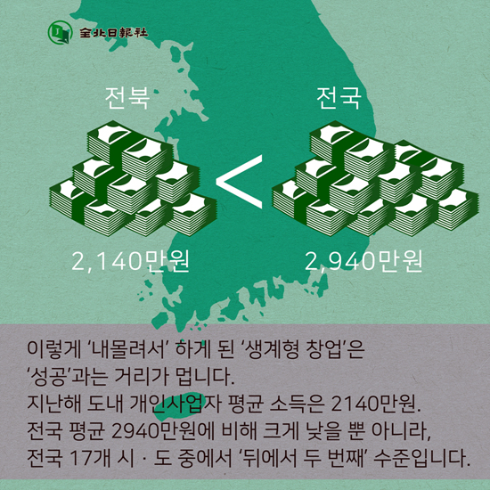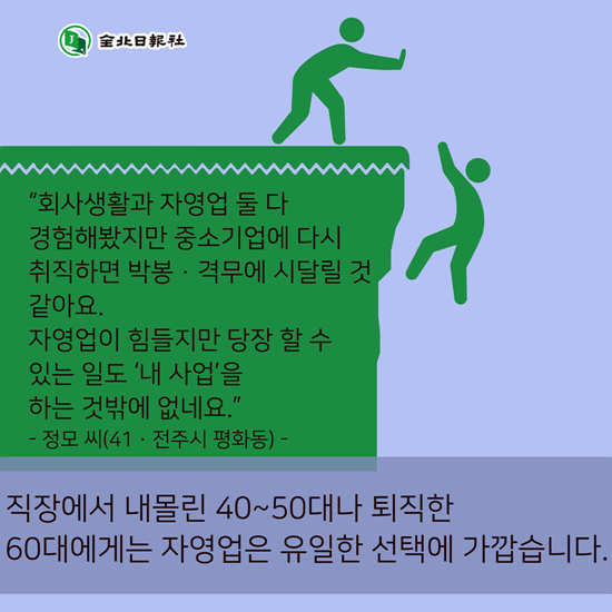 정모 씨(41·전주시 평화동)는 “회사생활과 자영업 둘 다 경험해봤지만 중소기업에 다시 취직하면 박봉·격무에 시달릴 것 같아요. 자영업이 힘들지만 당장 할 수 있는 일도 ‘내 사업’을 하는 것밖에 없네요.”라고 말합니다.
