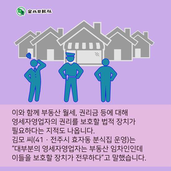 김모 씨(41·전주시 효자동 분식집 운영)는 “대부분의 영세자영업자는 부동산 임차인인데 이들을 보호할 장치가 전무하다”고 말했습니다.