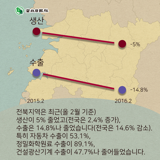 전북지역은 최근(올 2월 기준) 생산이 5% 줄었고(전국은 2.4% 증가), 수출은 14.8%나 줄었습니다(전국은 14.6% 감소). 특히 자동차 수출이 53.1%, 정밀화학원료 수출이 89.1%, 건설광산기계 수출이 47.7%나 줄어들었습니다.