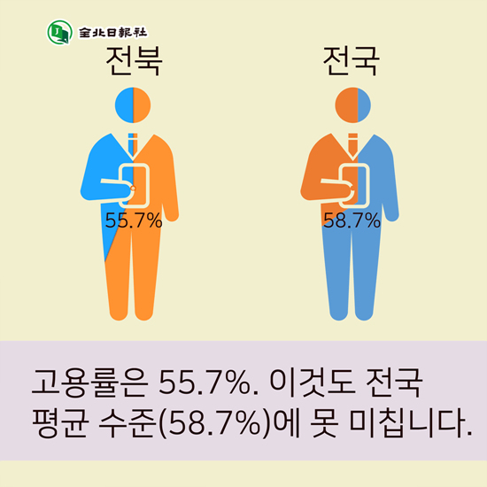 고용률은 55.7%. 이것도 전국 평균 수준(58.7%)에 못 미칩니다.