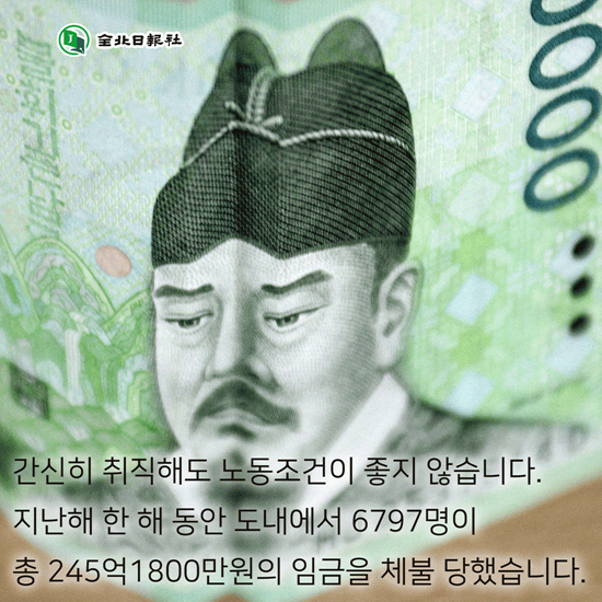 간신히 취직해도 노동조건이 좋지 않습니다. 지난해 한 해 동안 도내에서 6797명이 총 245억1800만원의 임금을 체불 당했습니다.