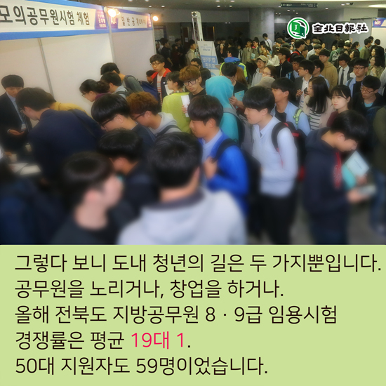 그렇다보니 도내 청년의 길은 두 가지뿐입니다. 공무원을 노리거나, 창업을 하거나.