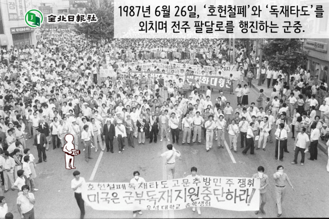 1987년 6월 26일, ‘호헌철폐’와 ‘독재타도’를 외치며 전주 팔달로를 행진하는 군중.