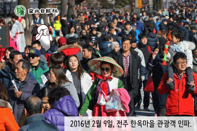 2016년 2월 9일, 전주 한옥마을 관광객 인파.