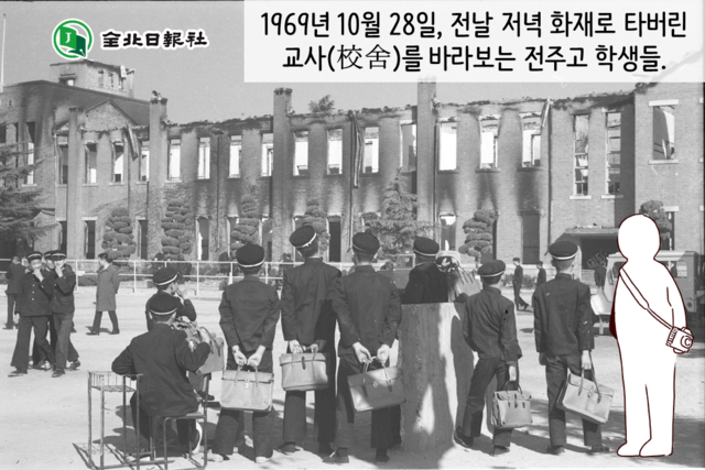 1969년 10월 28일, 전날 저녁 화재로 타버린 교사(校舍)를 바라보는 전주고 학생들.