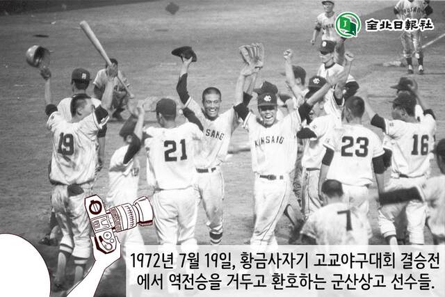 1972년 7월 19일, 황금사자기 고교야구대회 결승에서 역전승을 거두고 환호하는 군산상고 선수들.