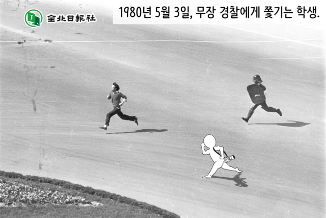 1980년 5월 3일, 무장 경찰에게 쫓기는 학생.