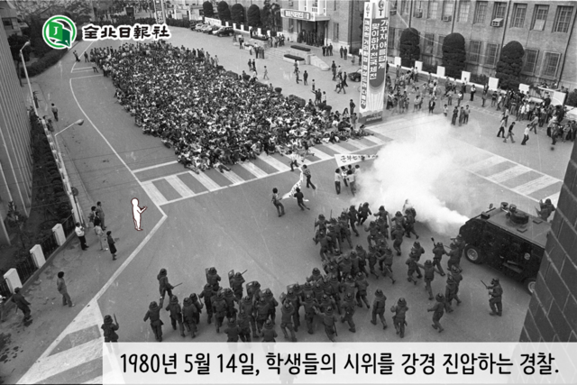 1980년 5월 14일, 학생들의 시위를 강경 진압하는 경찰.