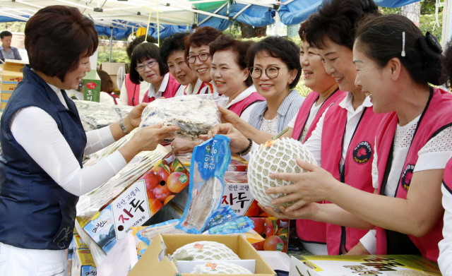 5일 추석명절을 앞두고 전주시청 민원실 앞에서 가 열린 가운데 전주시여성자원활동센터 봉사자들이 직거래장터를 찾은 시민들에게 제수용품을 판매하고 있다.