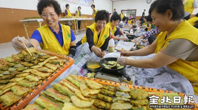 추석명절을 앞두고 6일 전주시 완산구청 강당에서 완산구해바라기자원봉사단 봉사자들이 관내 어려운 이웃들에게 전할 명절 음식을 만들며 웃음 짓고 있다.