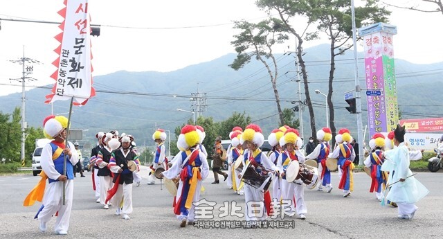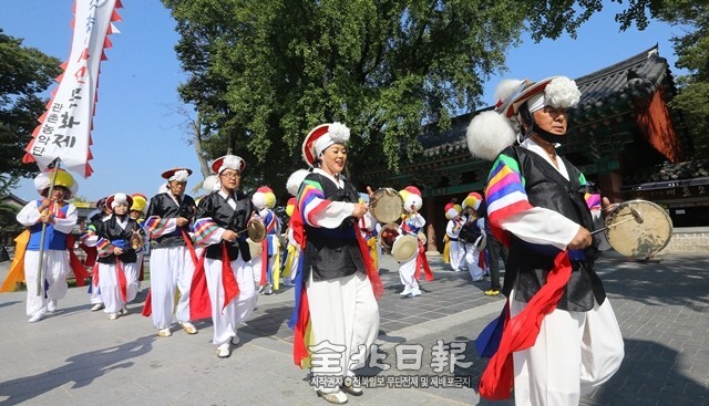제54회 소충·사선문화제 길놀이 공연이 열린 22일 전주 한옥마을에서 관촌농악단원들이 신명나는 풍물로 축제의 시작을 알리고 있다.