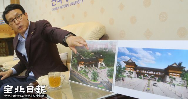 ▲ 전북대학교 이남호 총장이 개교 70주년을 맞아 준비 중인 한옥 정문의 조감도를 보며 설명하고 있다. 박형민 기자