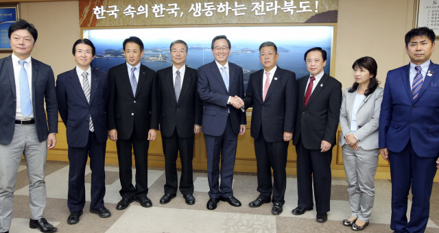 13일 우호관계 증진을 위해 전북을 방문한 일본 이시카와 의회 일한우호촉진연맹의원들이 송하진 도지사와 간담회를 한 뒤 기념촬영을 하고 있다. 사진 제공 = 전북도청