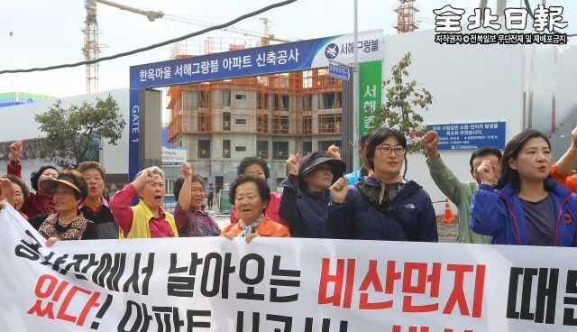 17일 전주시 견훤왕궁 2길과 물왕멀로 주민들이 인근 신축 아파트 공사현장 앞에서 집회를 갖고 공사장 비산먼지로 고통을 겪고 있다며 대책 마련을 촉구하고 있다.