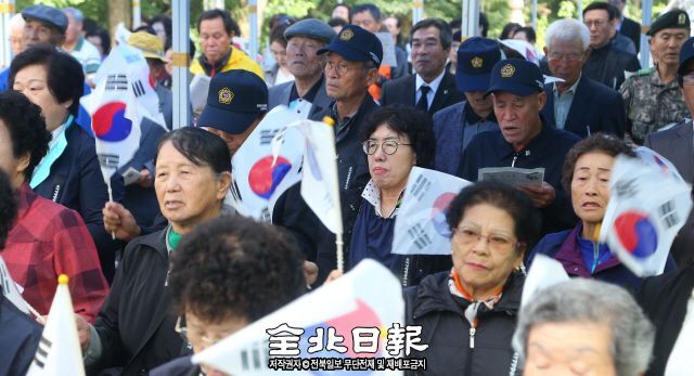 대한전몰군경유족회 전북지부가 주관하는 제7회 호국영령합동추모제가 18일 전주 다가공원 충렬탑 광장에서 열린 가운데 참석자들이 태극기를 흔들며 ‘6·25의 노래’를 부르고 있다.