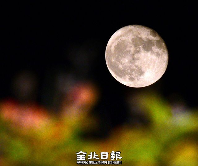 지난 17일 오후 익산 왕궁 단풍나무 위로 커다란 ‘슈퍼문’ 보름달이 떠 있다. 보름달 중에서 지구와 달의 거리가 평소보다 가까워지는 시기에 뜨는 보름달을 슈퍼문이라고 부른다. 달은 거의 19년 주기로 지구와 가까워지는 것으로 알려졌다. 슈퍼문은 평소 보름달보다 크기가 10% 이상 크고, 밝기도 30% 이상 밝다. 슈퍼문 현상은 달이 지구를 타원형 궤도로 공전하고 있기 때문에 나타난다.