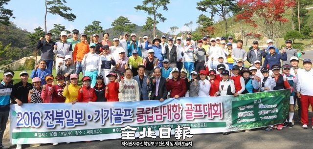 19일 전북일보와 전북프로골프회가 주관한 ‘2016 전북일보·기가골프 클럽팀대항 골프대회’가 써미트CC에서 열린 가운데 서창훈 전북일보 회장과 대회 관계자, 참가자들이 파이팅을 하고 있다.