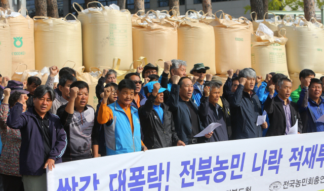 전국농민회 전북연맹 회원들이 20일 전북도청 앞에서 을 벌이며 쌀값 폭락에 따른 대책 마련을 촉구하고 있다. 농민회는 이날 800~1000㎏ 건조벼 180여 포대를 적재한 뒤 기자회견을 열고 “적정재고량 초과 물량인 100만 톤 수매계획을 마련할 것을 요구한다”며 “수매가는 최소 2015년 우선지급금인 40㎏에 5만2000원으로 매입해야 한다”고 주장했다.