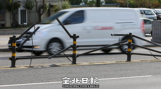 교통사고 예방을 위해 도로 곳곳에 간이 중앙분리대를 설치했지만 쉽게 파손되고 보수가 제때 이뤄지지 않아 사고를 막기 위해 설치된 분리대가 사고를 유발하는 요인이 되고 있다. 25일 전주 백제대로에서 간이 중앙분리대가 파손된 채 방치되고 있다.