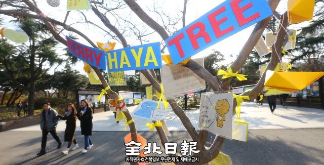 24일 연일 계속되는 최순실 사태로 높아진 국민들의 분노가 해학과 풍자로 표출되고 있는 가운데 전북대학교에서 대통령의 하야를 촉구하는 대학생들의 메시지가 담긴 ‘MERRY HAYA TREE’(메리 하야 트리)가 설치돼 눈길을 끌고 있다.