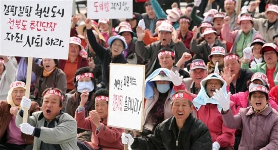 그러나 애초 전북에 이전을 약속했던 지적공사와 토지공사가 LH공사로 통합, 경남진주혁신도시로 빼앗겼다. 그동안 여러 차례 정부가 약속해온 LH 분산배치가 무산되자 도민들의 분노는 극에 달했다.