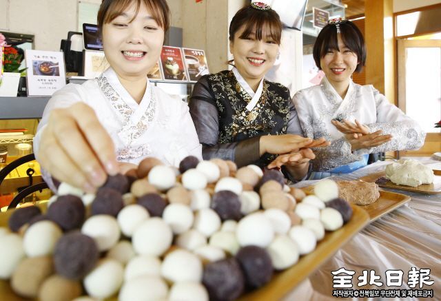 동짓날을 하루 앞둔 20일 오전 전주시 중화산동의 한 팥죽집에서 농촌진흥청 직원들이 유색 발아 현미로 만든 새알심을 빚고 있다.