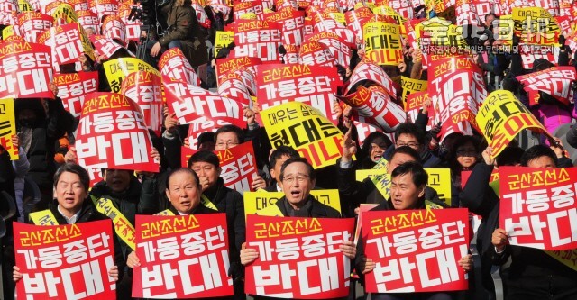 14일 군산시 롯데마트 앞 도로에서 열린 현대중공업 군산조선소 존치를 위한 범도민 총 결의대회에서 송하진 도지사와 안철수 국민의당 전 대표, 김관영, 이춘석 국회의원, 문동신 군산시장과 시군 단체장, 현대중공업 노동조합 및 협력사 등 도민들이 군산조선소 존치를 염원하는 구호를 외치고 있다.