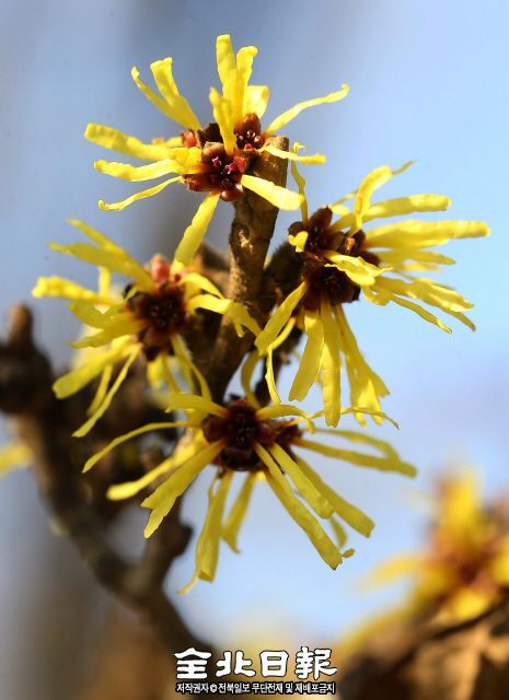 21일 한국도로공사 전주수목원에서 활짝 핀 풍년화가 봄소식을 전하고 있다. 이른 봄, 꽃이 풍성하게 피면 그해 풍년이 든다고 전해진다.