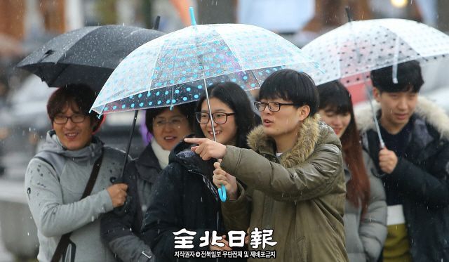 전국적으로 비나 눈이 내린 22일 전주 한옥마을 방문객들이 우산을 쓰고 한옥마을의 정취를 만끽하고 있다.