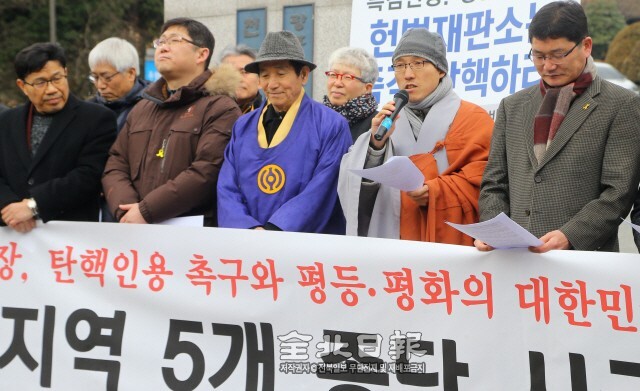 23일 전주지방법원 앞에서 도내 5개 종단 관계자들이 특검 연장과 조속한 탄핵 인용을 촉구하는 시국선언을 하고 있다.