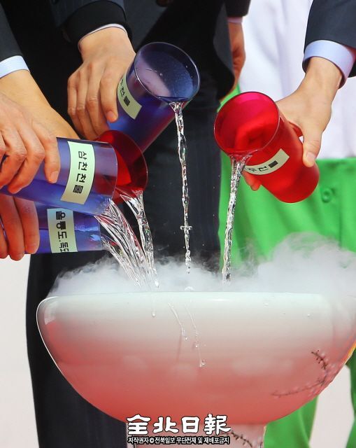 ‘2017 세계 물의 날’ 기념식이 22일 전주 삼천 둔치에서 열린 가운데 참석자들이 울릉도와 독도에서 퍼온 물과 삼천, 전주천의 물을 합수하는 퍼포먼스를 하고 있다.