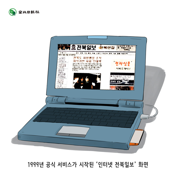 (투박한 노트북 컴퓨터. 노트북 화면에는 1999년 공식 서비스가 시작된 ‘인터넷 전북일보’ 화면)