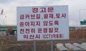 경기장에서 비신사적 행위를 한 선수에게 심판에 내미는 것도 빨강(레드) 카드다. 언필칭 악귀야, 썩 물렀거라다. ‘좌파’들의 ‘불온서적’도 ‘빨강 책’이라고 했다. 19금 도색잡지 또한 빨강 책으로 비유했다. 마녀사냥을 당한 사람에게 찍는 낙인도 ‘빨강(주홍) 글씨’다. 그림 속의 경고문도 아주 그냥 순전히 빨강이다. 담배 한 대를 맛나게 피우며 비탈로 꺾어진 ‘급커브길’을 지나다가 이렇게 빨강 일색인 경고문을 발견한 운전자는 과연 거기 적힌 대로 ‘천천히 운행’해서 ‘골재’나 ‘토사’가 ‘쏟아지지 않도록’ 더 조심하게 될까. 의문이다. 우석대 문예창작학과 교수
