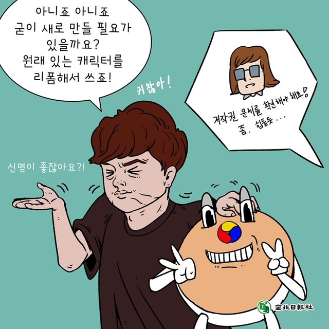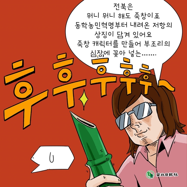 K : 전북은 뭐니 뭐니 해도 죽창이죠 동학농민혁명부터 내려온 저항의 상징이 담겨 있어요. 죽창 캐릭터를 만들어 부조리의 심장에 꽂아 넣는….