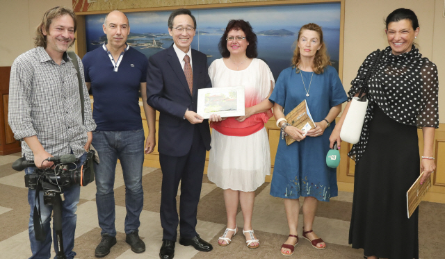 대한민국과 불가리아 기자협회 교류행사로 10일 전북도청을 방문한 불가리아 기자협회 대표단(대표단장 나타샤 도미노바 불가리아 기자협회 감독위원회 위원-가운데)이 송하진 도지사와 한-불가리아 관계정립과 한국의 이미지 홍보 등 언론차원의 상호 협력 간담회를 갖고 기념촬영을 하고 있다. 사진제공=전북도
