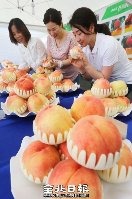 제19회 전주복숭아축제가 열린 27일 전주종합경기장에서 시민들이 명품 복숭아로 선발된 복숭아를 보고 있다.