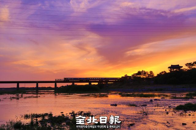 여름 내 기승을 부리던 무더위가 한풀 꺾이고 처서를 앞두고 제법 선선한 산들바람이 스쳐 지나간다. 완주 삼례의 비비정과 끊긴 옛 철도가 붉게 물든 저녁노을을 바라보고 있다.