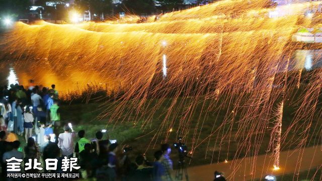 26일 무주군 남대천에서 관광객들이 비처럼 쏟아지는 무주 안성 낙화놀이를 즐기고 있다. 낙화놀이는 전통 불꽃놀이로 숯가루와 소금 등을 채운 낙화봉을 긴 줄에 매달아 불을 붙이면 불꽃이 바람을 타고 날리며 장관을 연출한다.