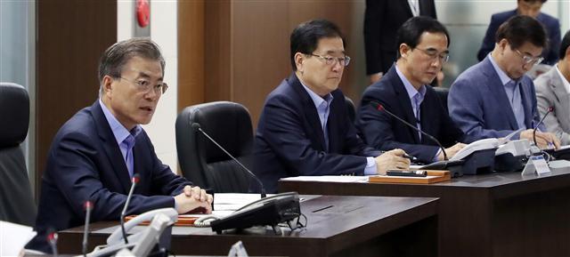 문재인 대통령이 3일 오후 청와대에서 국가안전보장회의(NSC) 전체회의를 긴급 소집해 북한의 6차 핵실험과 관련, 대응 방안을 논의하고 있다. 왼쪽부터 문 대통령, 정의용 국가안보실장, 조명균 통일부 장관, 서훈 국가정보원장. 연합뉴스