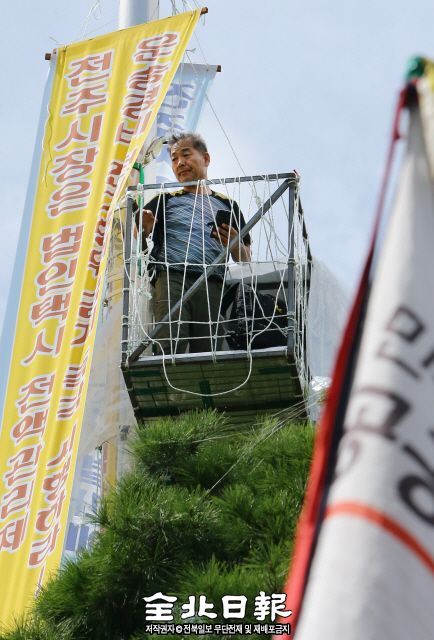 4일 민주노총 공공운수노조원이 택시 전액관리제의 이행을 촉구하며 전주 노송광장 조명탑에 올라 망루농성을 하고 있다.