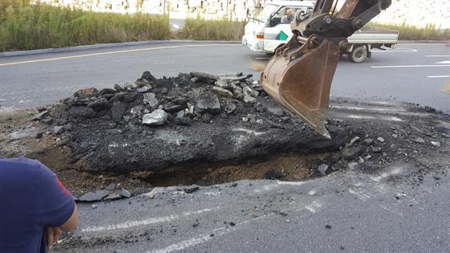 군산시 측은 경찰의 협조를 받아 백토고개 지하차도 우회전 차로를 차단하고, 도로보수 장비와 시공회사의 중장비를 활용해 응급 복구에 나서 이날 오후 6시께 완료했다.