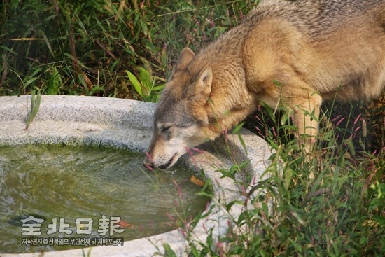 철창으로 된 좁은 우리에서 나무와 굴이 있는 서식환경으로 탈바꿈한 전주동물원 '늑대의 숲'에서 늑대 한 쌍이 휴식을 취하고 있다.