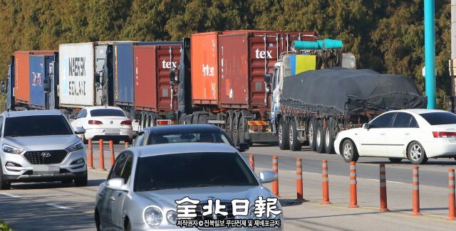 13일 전주동부대로 갓길에 대형 화물차들이 줄지어 주차돼 있다. 인근 주유소 출입로와 이어져 있어 사고 위험 요인이 되고 있다.