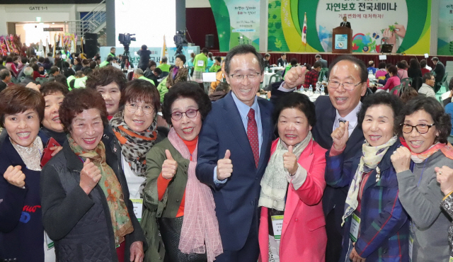 14일 무주 태권도원에서 ‘기후변화에 대처하자’라는 주제로 열린 제38회 자연보호 전국세미나에서 송하진 도지사가 전북회원들과 기념촬영을 하고 있다. 사진제공=전북도