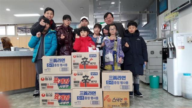 효자태권도장 관원들은 어려운 이웃에게 전달하기 위해 용돈 등을 모아 라면을 구입했다. 평화1동은 이날 전달받은 라면을 독거노인 등 저소득층 10가정에 전달할 계획이다.