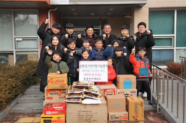 전주시 덕진구 송천2동에 자리한 효경석사태권도 김수환 관장과 관원들은 18일 송천2동(동장 임익철) 주민센터에 백미와 라면 등을 기증했다.