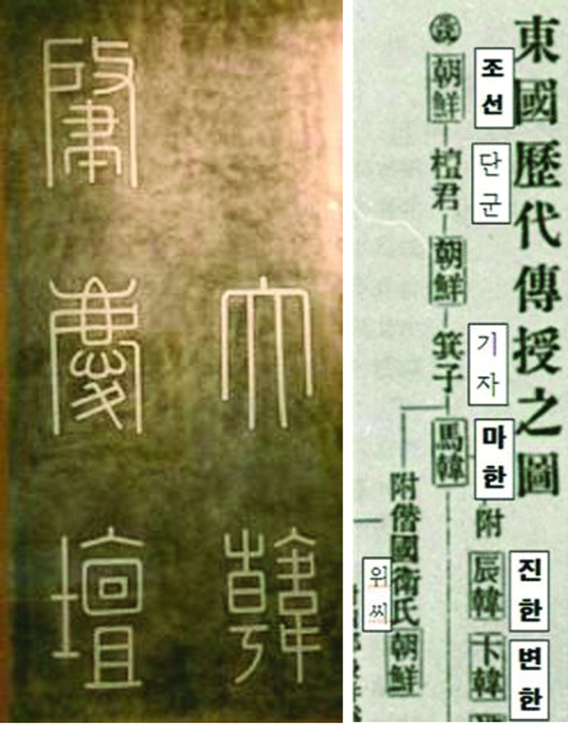 ▲ 왼쪽=1899년 세운 전주 건지산 조경단의 ‘대한조경단’비석 탁본, 고종은 조선왕조의 발상지 전주를 대한제국의 발상지로서 재정립하고 조경단을 ‘대한조경단’으로 새롭게 정비하였다. / 오른쪽=《동사강목》에 제시된 동국역대전수지도에 나타난 단군-기자-마한 계승도