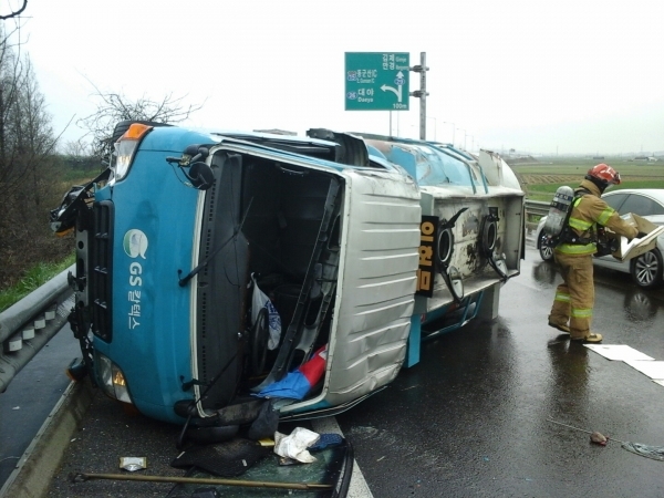 5일 오전 11시 44분께 군산시 대야면 대야교차로 인근 도로에서 A씨(54)가 운전하던 유조차량이 전도되며 유조차에 실려있던 정제유 800여 리터가 도로 위로 쏟아졌다.