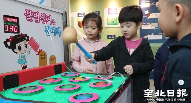 24일 도선거관리위원회 청사 내에 설치된 선거 놀이터에서 서신어린이집 아이들이 선거와 연계한 ‘불법선거를 잡아라’두더지 게임 등을 하며 선거의 의미에 대해 배우는 시간을 가졌다.