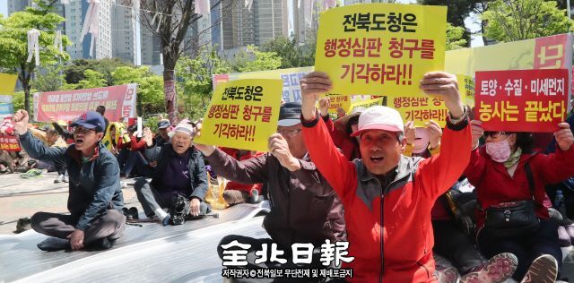 25일 도청 앞에서 군산학교급식개선운동본부가 군산지역 학생들에게 공급되는 친환경농산물 생산단지와 친환경학교급식지원센터 인근 레미콘 공장 설립 반대 집회를 하고 있다.